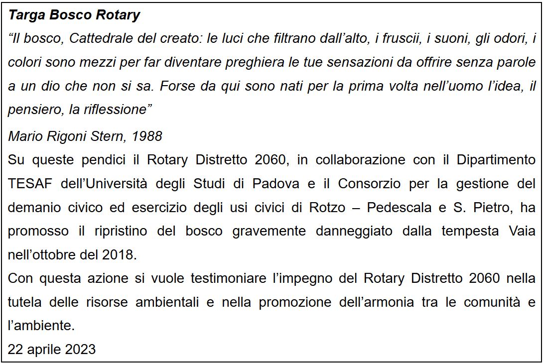 Questi concetti sono stati ben richiamati ed espressi con parole sapienti lo scorso 19 ottobre 2024, quando, nonostante il clima decisamente autunnale, rotariani ed amici si sono ritrovati a Campolongo di Rotzo per scoprire la targa che dà valore simbolico Immagineallegata-4.pngal Bosco e ne illustra le finalità ai visitatori.